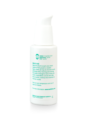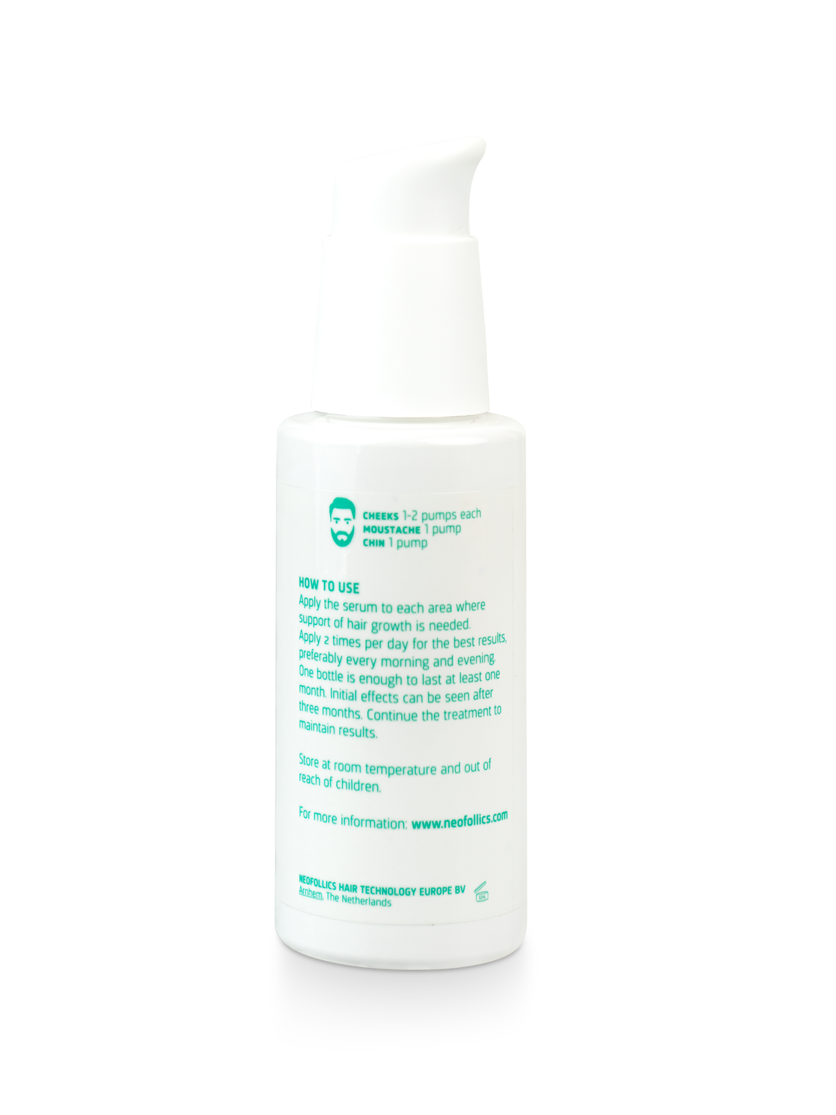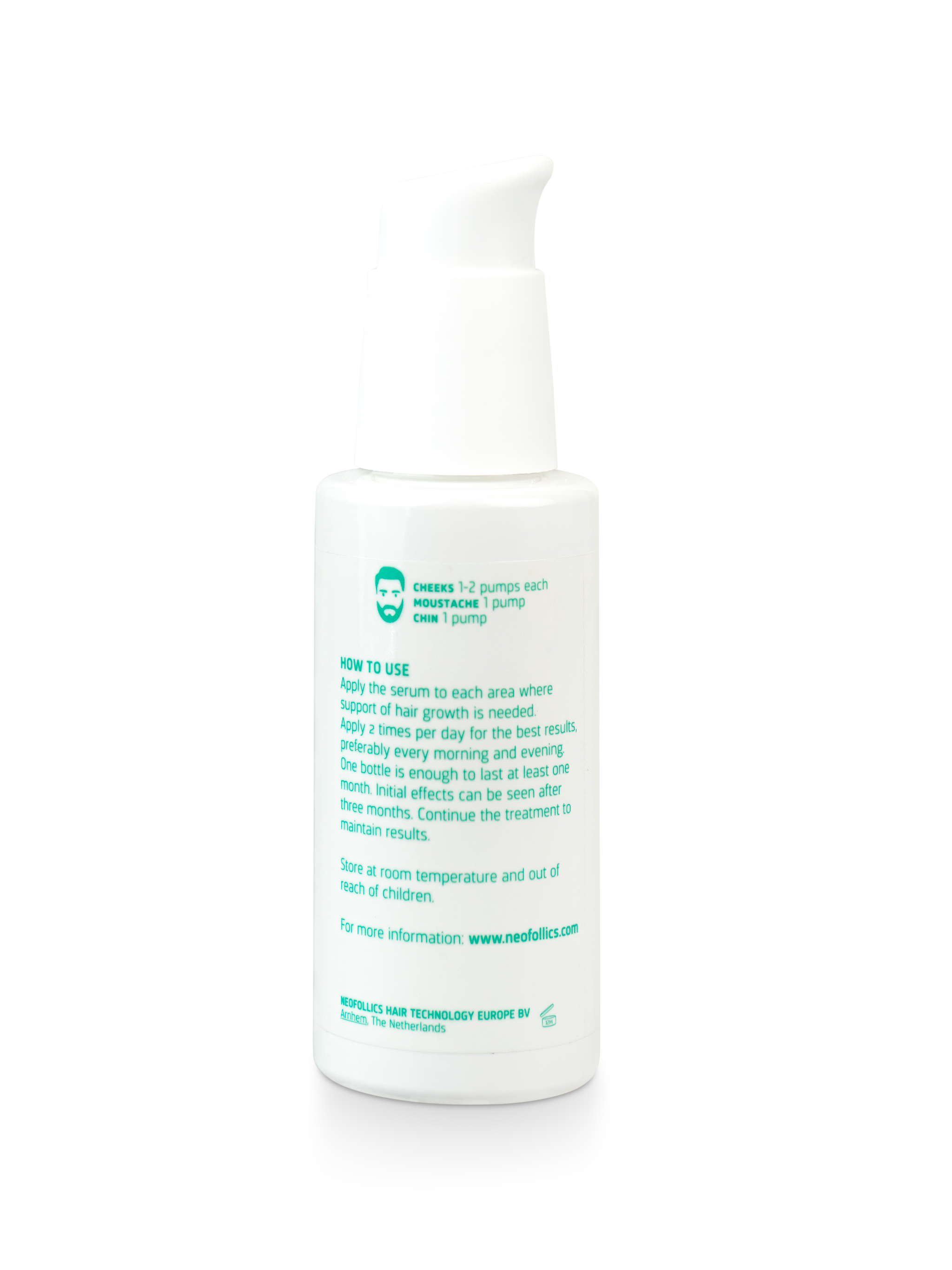 Before each application, cleanse the face thoroughly with water. Apply the Neofollics Beard Growth Serum to the areas where hair growth support is desired. Use 1 to 2 pumps for each cheek area and 1 pump for both the chin and the moustache area. Massage the serum gently into the skin to ensure optimal absorption.
